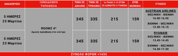 ημέρες σας με τον καλύτερο δυνατό τρόπο. Φροντίσαμε παράλληλα να έχετε χρόνο στη διάθεσή σας, ώστε με την καθοδήγηση του Έλληνα συνοδού που θα βρίσκεται συνεχώς μαζί σας, να δείτε και σημεία που ενδιαφέρουν εσάς ατομικά. Ο τοπικός ξεναγός θα σας μεταφέρει εκτός των άλλων, τον τρόπο ζωής και την καθημερινότητα των Βιεννέζων. Tα ξενοδοχεία είναι ειδικά επιλεγμένα, ώστε να έχουν καλή σχέση ποιότητας – τιμής (value for money). Οι συνοδοί μας είναι έμπειροι, ευχάριστοι και διαθέσιμοι να σας βοηθήσουν να ζήσετε ένα υπέροχο ταξίδι. Για τα ραντεβού με αξιοθέατα, την εξασφάλιση εισιτηρίων, εστιατόρια, κονσέρτα κλπ μην ανησυχείτε, είναι όλα έτοιμα.. Εσείς απλά ετοιμάστε βαλίτσες, πάρτε μαζί σας ζεστά ρούχα και γνωρίστε την αρχοντική και