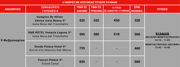 - Εγγυημένες θέσεις στις απευθείας πτήσεις Ryanair για το αεροδρόμιο Treviso της Βενετίας διαμονή σε επιλεγμένα ξενοδοχεία 3* & 4* μέσα στη Βενετία